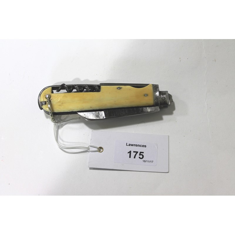 A Gentlemans Pocket Knife with ivory grips and multi-purpose tools. Including a corkscrew, spike and file/blade also a smaller blade. Marked Rodgers Cutlers to His Majesty. C1920. The steel backstrap can also be used as a hook, 8.1/2" maximum overall length.