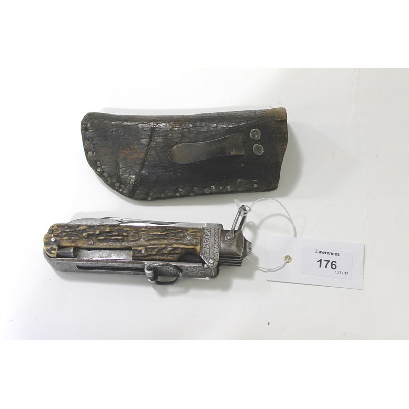 A staghorn grip multi-purpose horseman,s or riders knife in a leather belt pouch. Including Bowie shaped and a smaller blade, also a saw blade. Leather punch, corkscrew and spike, covered by a hinged flap with engraved decoration. No visible maker evident, though of some age and possibly 19thC.