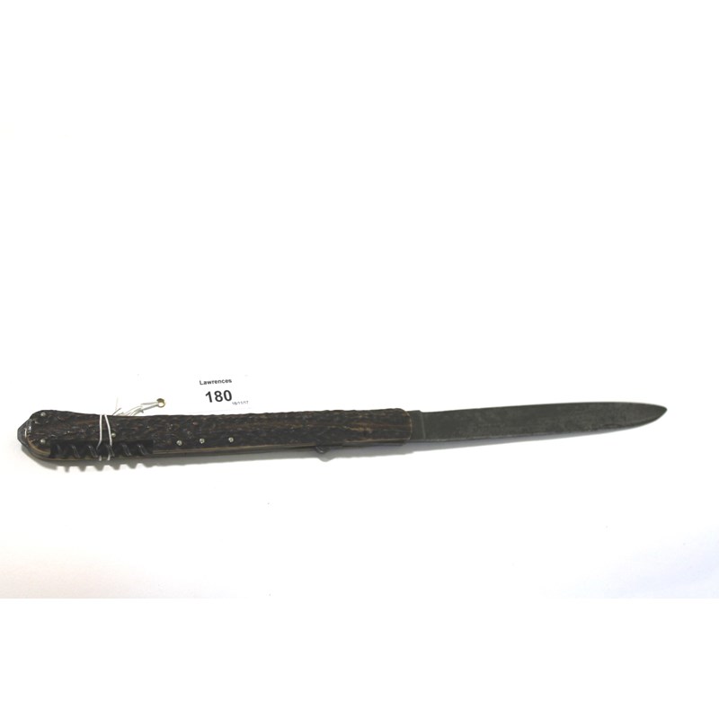 A Staghorn grip deer despatching lock-knife with top button release. 6.1/2" blade marked Deer Knife and Webster & Sutton manufacturers. A corkscrew is fitted ion the hilt, just over 15" overall length.