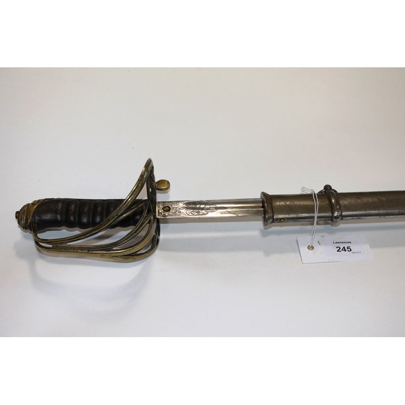 A Victorian officers sword with a 33" long clean blade, having a three-quarter fuller. Both blade and the brass hilt have the VRI cypher, also leaf and foiliage designs. Complete with a plated steel scabbard, it would appear to have been made and purchased in 19thC India.