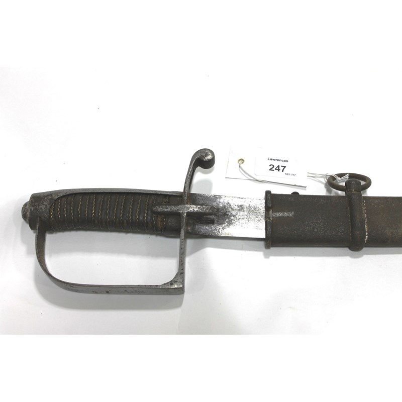 A Troopers Light Cavalry sword, in the style of the 1788 pattern, with steel scabbard. Single edged curved 32" blade with 7/8th length wide fullers, steel hilt with wire wrapped grip. Dual langets that locate the blade into the single ring mount scabbard, some rust evident.