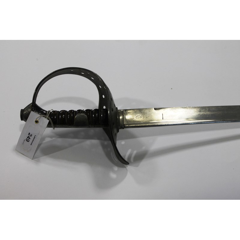 A 19thC Cavalry Sword with pipeback with spearpoint 33" blade, having a pierced steel hilt. The plated blade bear the mark of Wyersberg & Co Solingen, lacking a scabbard.
