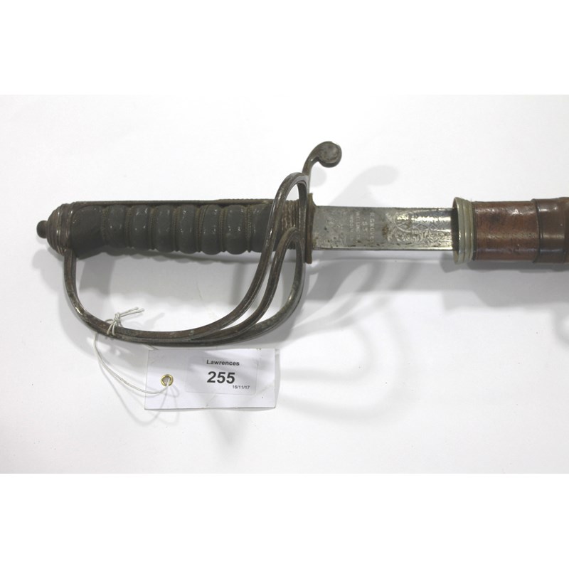 A three bar hilt officers sword with brown leather field scabbard. George V cypher on the 34" blade also Royal Artillery device, marked R Groves 53 Wellington St, Woolwich.