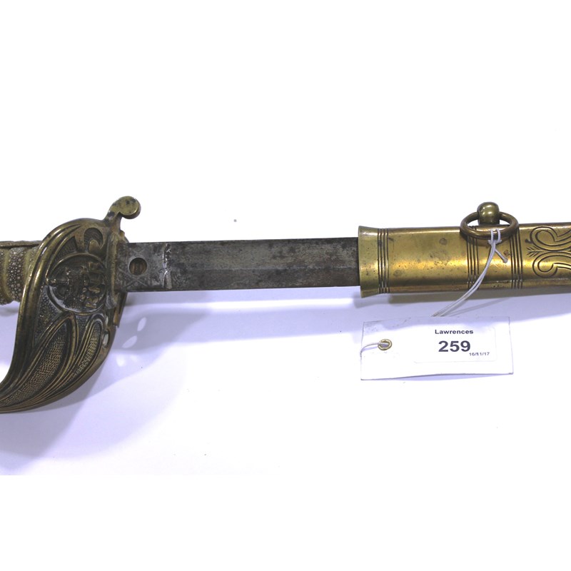 A Royal Naval Reserve officers sword and scabbard, with imperial crown and R N R in the guard. The blade with Imperial crown and Dieu et Mon Droit amid foiliage, is some 31.1/2" in length. It appears to have been repaired at some time, by brazing around two thirds along its length. Traces of the maker or suppliers name remain, the scabbard of brass mounts and leather.