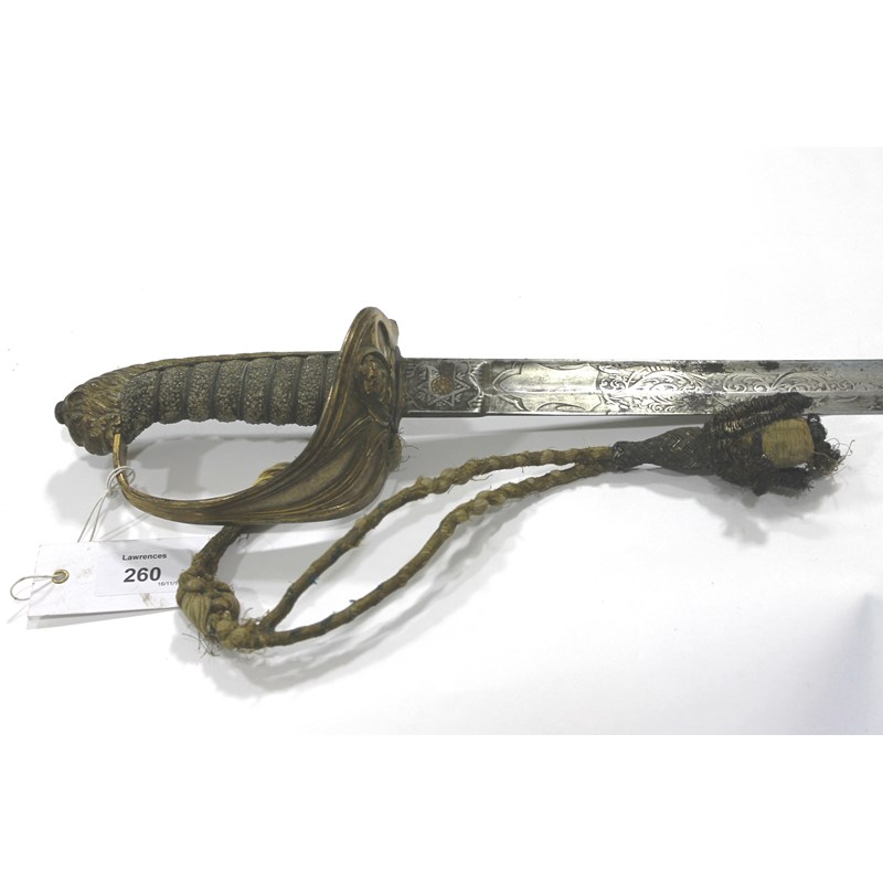 A Victorian Royal Navy officers sword with a folding guard and old sword knot attached. The blade with Royal Coat of Arms and an anchor, 29.3/4" in length. Marked Mackay & Co Outfitters Devonport, the blade with a Lions Head pommel and crown over anchor in the guard, lacking a scabbard.