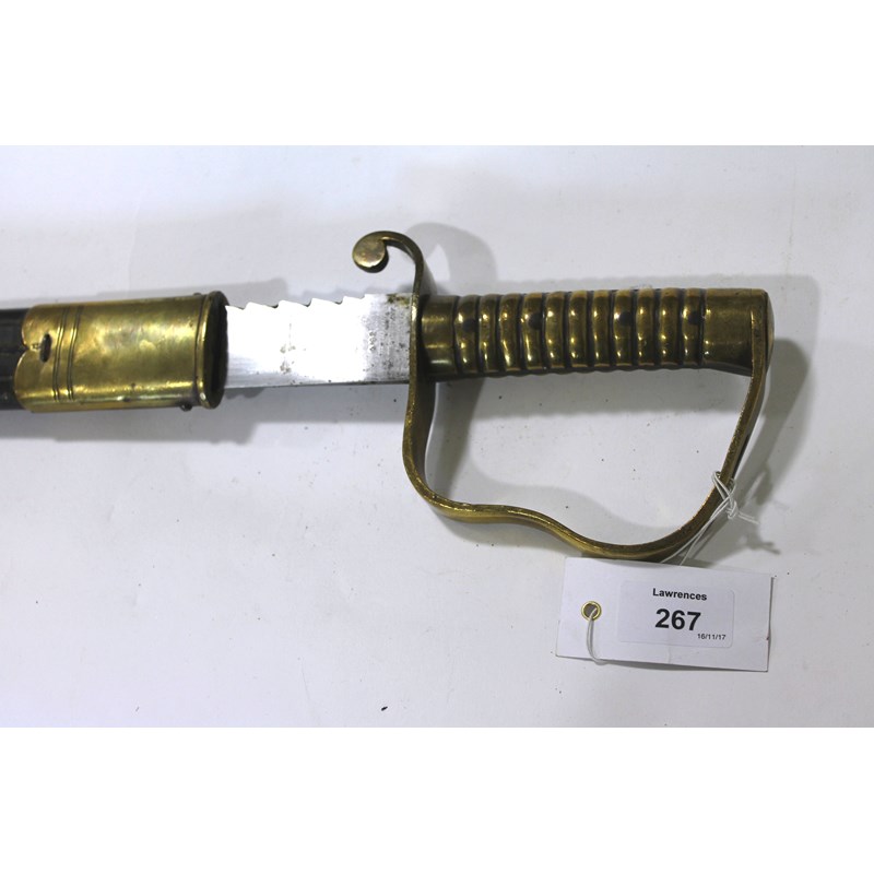 An 1856 pattern sawback sword or sidearm, marked Wilkinson Sword Company London. Other markings on the blade include the Wilkinson test mark, also 4'92 and WD, etc. Complete with a brass mounted scabbard, having a 22.1/2" blade length.