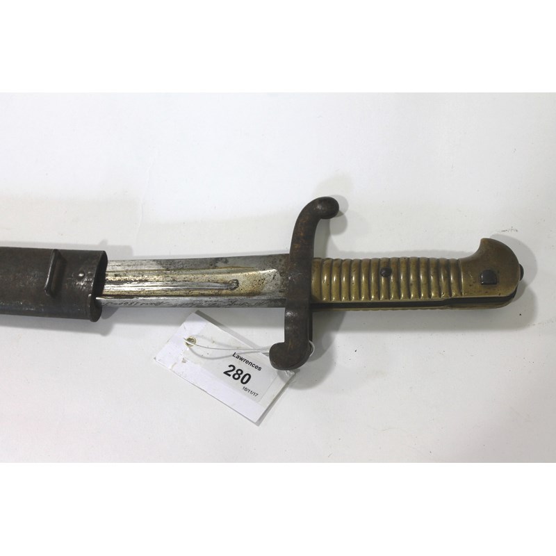 A FRENCH 1842 PATTERN BAYONET. A French model 1842/59 sabre bayonet complete with steel scabbard and various markings.