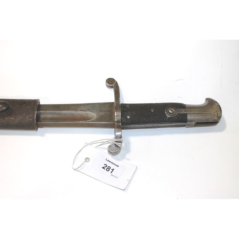 A SWORD BAYONET & SCABBARD. An 1856 pattern sword bayonet with various issue marks, complete with a scabbard