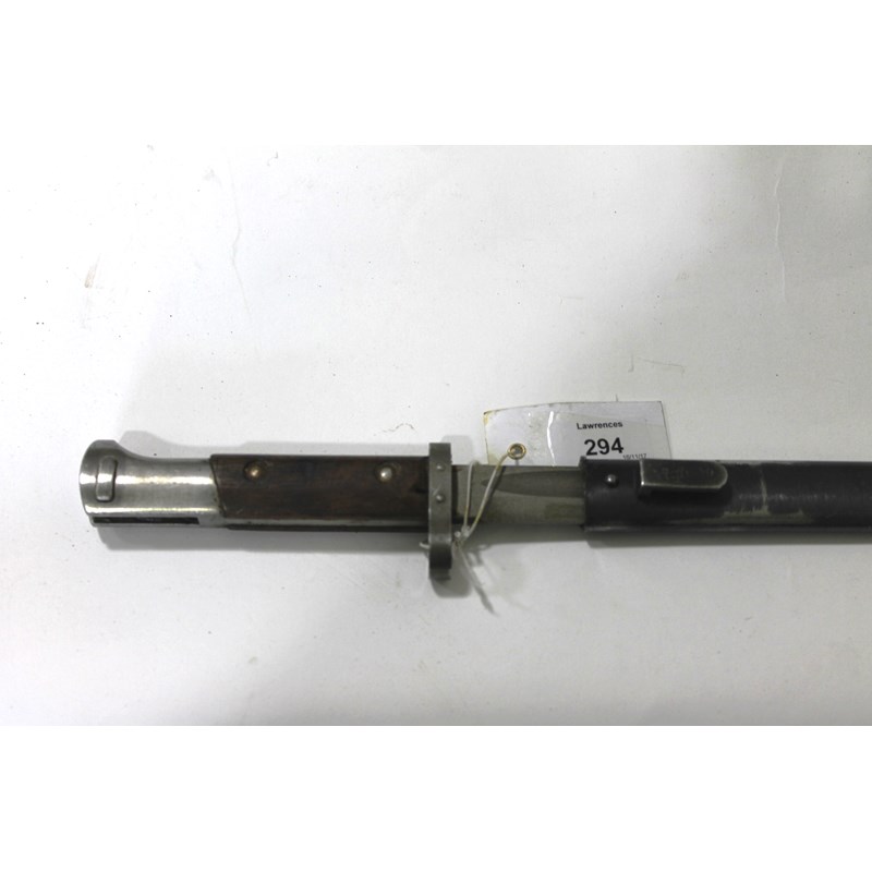 A model 1891/5 bayonet and steel scabbard, the only mark found on the frog mount, tgf E3 (lion) 48. Used by Austrian and Greek troops, with cutting edge reversed.