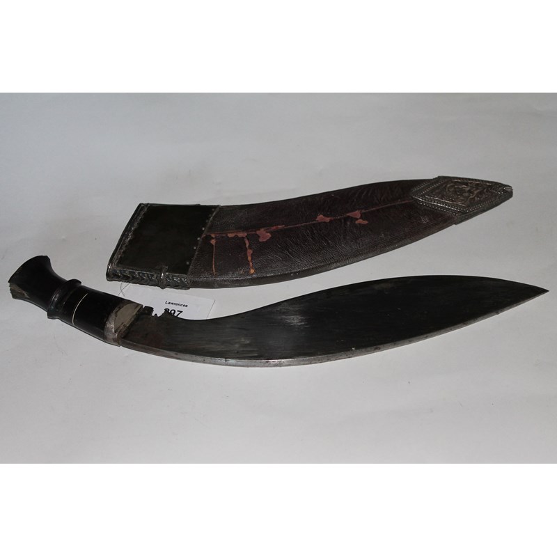 A horn hilted Kukri with silver mounted scabbard, of wood with leather covering. A broad 12.1/4" blade length, some damage to the hilt evident. The partial silver covering of the scabbard depicts a hunting dog in a panel, also foiliage designs.
