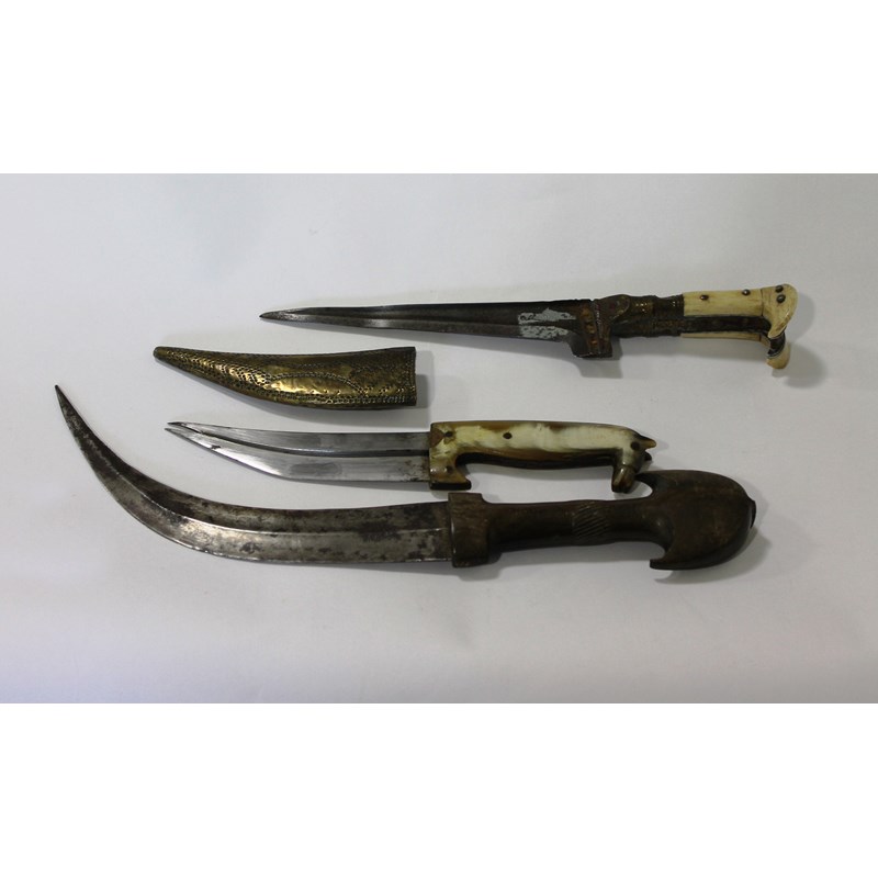 A Pesh Kabz dagger with bone hilt and 7" blade, lacking a scabbard. A horn grips horsehead hilt dagger with 5.1/2" blade having a central spine and forked tip, complete with a brass scabbard. A North African Jambiya dagger with slender 9.1/4" curved blade and wooden carved hilt, lacking a scabbard.