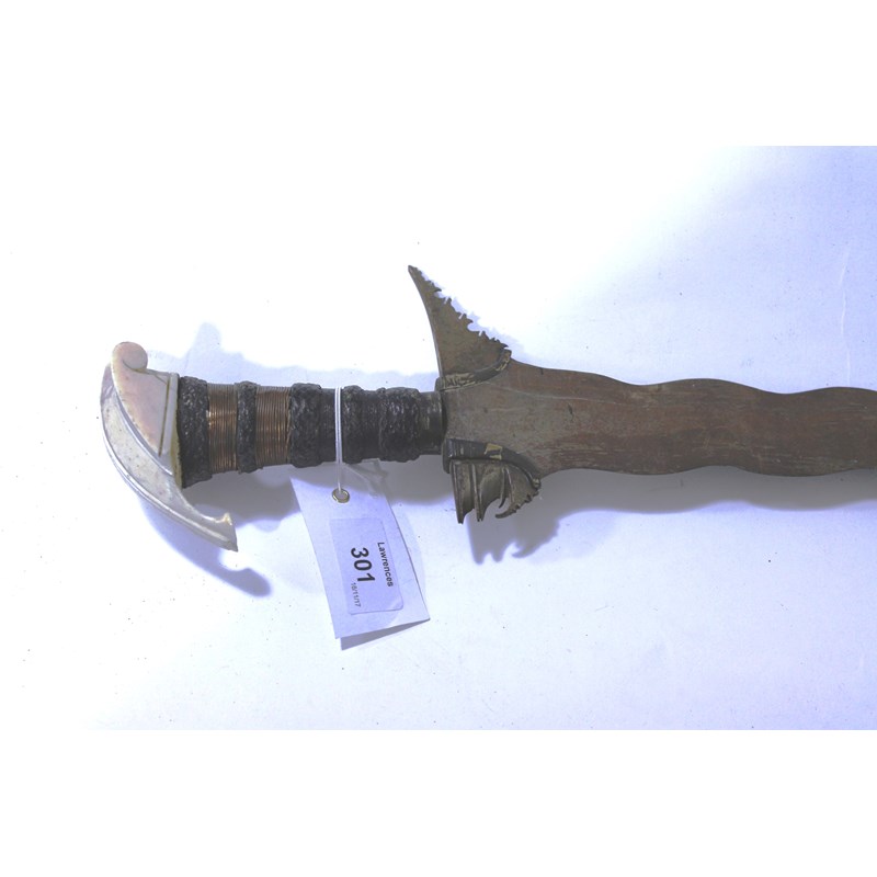 A 19thC Kris with bound hilt with a shaped Ivory pommel, lacking a scabbard. A 21" long wavy edge blade, with gilt and silvered decoartion. The pommel of a diving bird shaped design with some loss on one side. Overall length of 26" with a rounded point.
