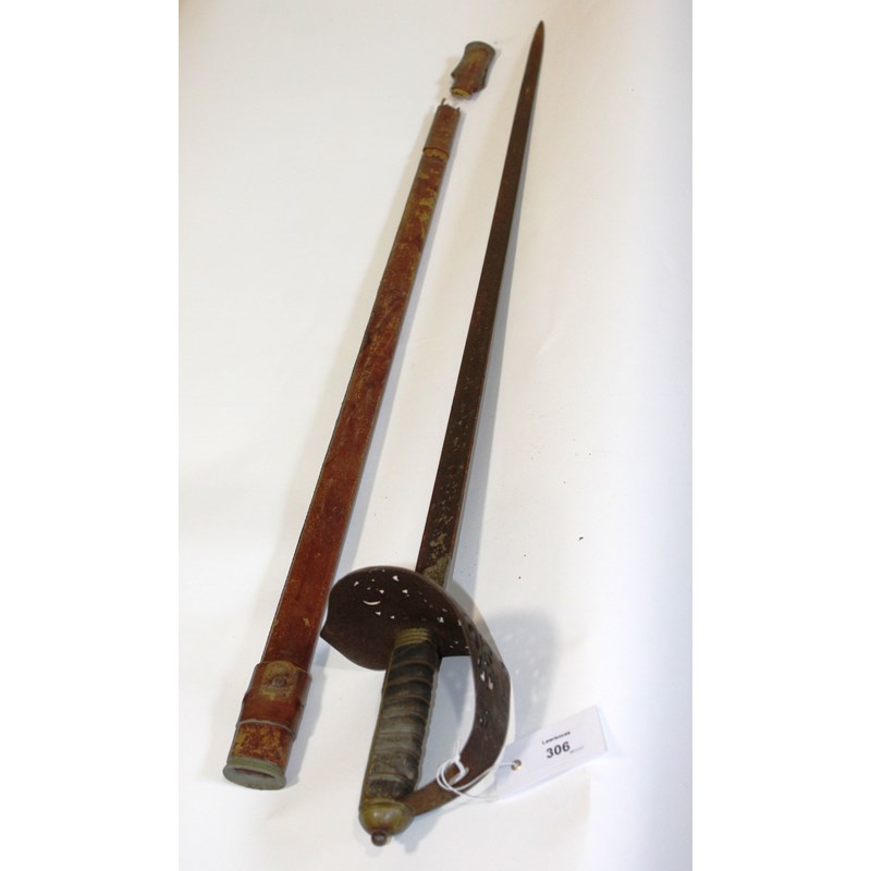 A Royal Artillery officers three bar hilt sword, complete with brown leather field scabbard and outer carrycase. The blade and hilt have at some time been re-plated, the guard with brown leather swordknot affixed. A second extremely rusty officers 1897 pattern GV period sword, complete with brown leather scabbard. (2)