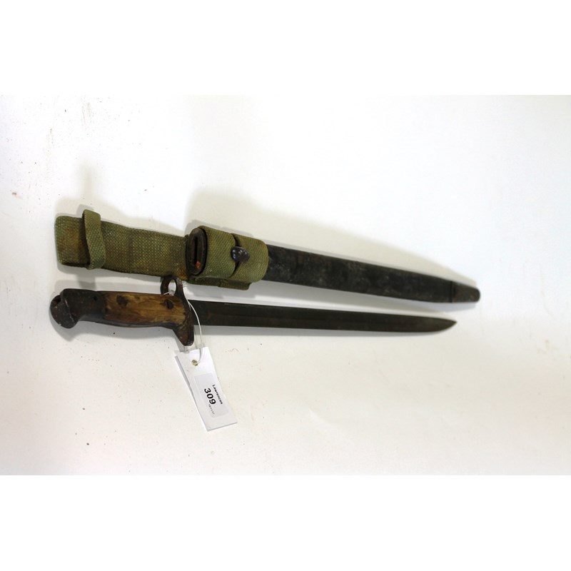 A 1907 PATTERN BAYONET & SCABBARD/FROG. A 1907 pattern Wilkinson stamped bayonet, with scabbard and frog having various military issue stampings.