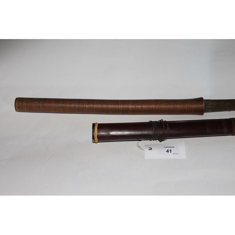 A 20thC DHA SWORD. A Dha sword from Thailand in the style favoured by the Burmese. Bound 14" hilt with a 26" blade. Contained in a two-part wooden scabbard with outer bindings.