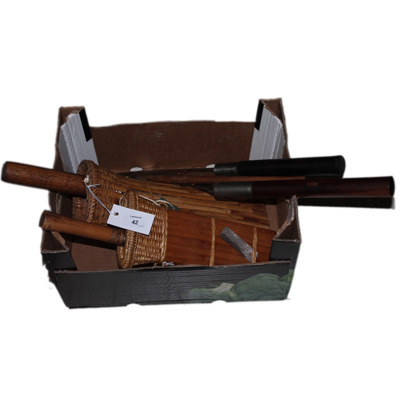 Five Eastern knives including a Cambodian Machete style knife with a 10" blade, overall length of 22". A Kadeng with short 4" blade on a 13,1/2" hilt. A Laos region Machete with 11" curved blade. Late Machetes from Laos or China in bamboo scabbards, 11.3/4" and 9.3/4" blades respectively. (5)