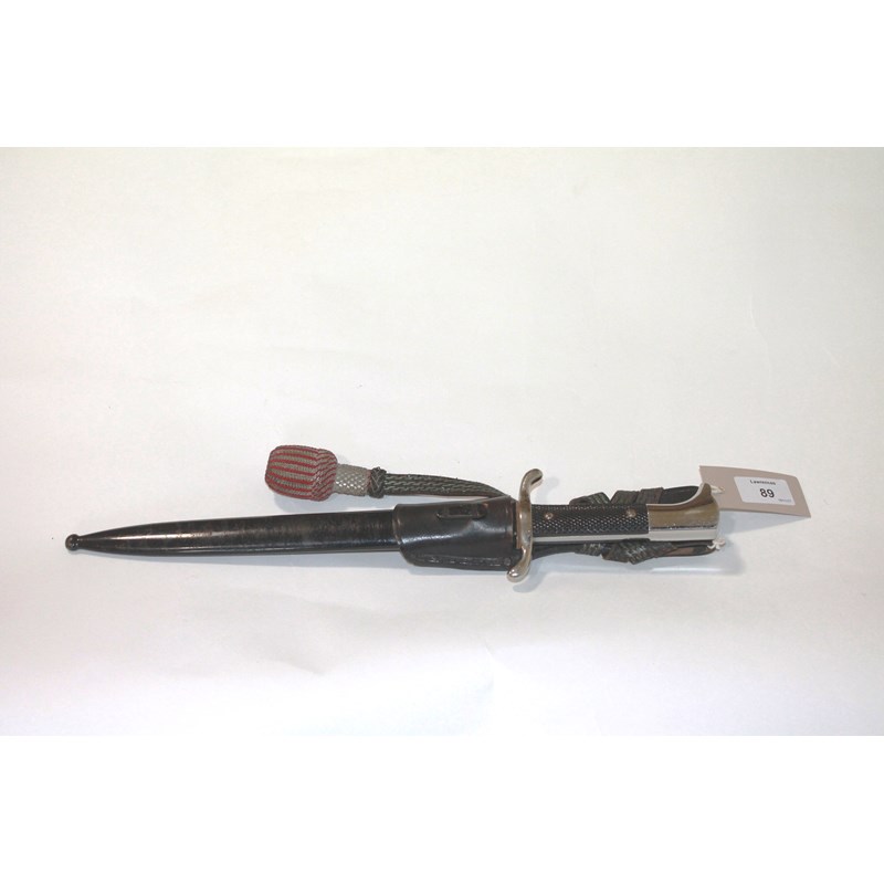 A very clean German Fire Service Dagger with forward and reverse quillions, black chequered grips. Bearing the mark Original, Eickhorn Solingen, together with the squirrel holding a sword mark. Exceptionally 9.7/8" blade with three-quarter fullers. Complete with a black metal scabbard and leather frog, having a red and silver bullion swordknot attached.