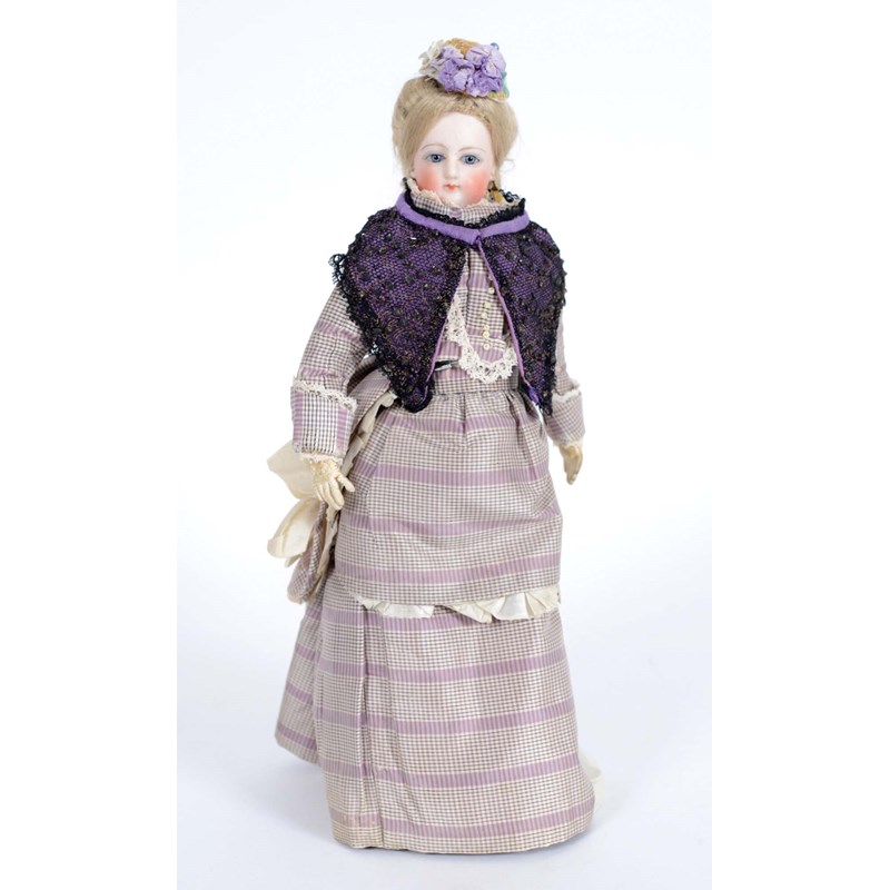 possibly by F.G, circa 1870 and with a bisque swivel head, blue paperweight glass eyes, pierced ears with earings and painted mouth. With a leather body, gusseted with seperate fingers and with hand made clothing (old fabrics). Also with an extra outfit and her original bonnet. 11ins (28cms) high