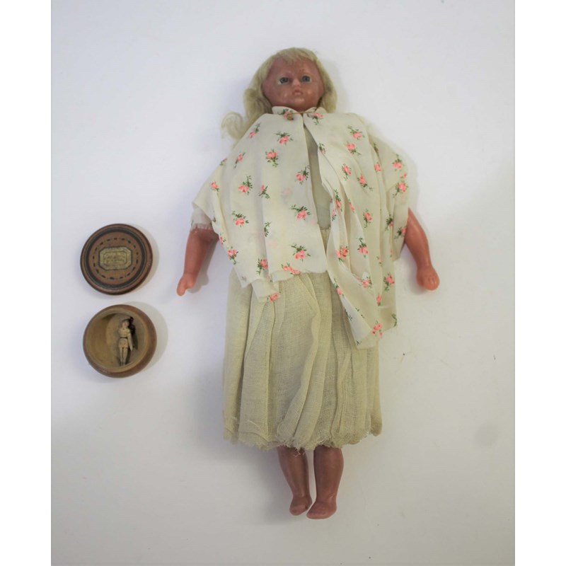 the doll with wax head and shoulder plate, and also with wax limbs. Also with a miniature wooden doll (missing an arm) in a small wooden box, the box dated 1824 inside in ink. Wax Doll 11ins (28cms) high. (2)