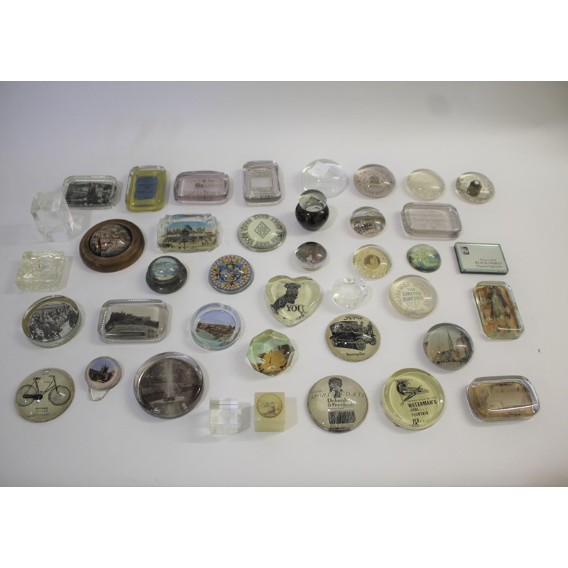 a collection of paperweights including Ropeworks Belfast, Arnold & Sons Surgical Instruments, Burroughes & Watts Billiard Tables, Watermans Fountain Pen, Gamages Cycles, and various other advertising examples. Also with paperweights with Place Names, Kyles of Bute, Edinburgh Castle, Lyme Regis, Newquay, Shakespeare's Birth Place etc, and various others including Queen Victoria, R.A.F etc.