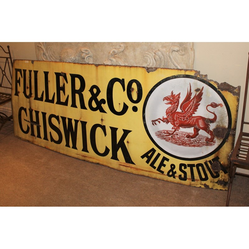 an unusually large enamel sign for Fuller & Co, Chiswick, Ale & Stout, with a Griffin emblem on one end. Marked on the sign, Patent Enamel Co Ltd, 26 Cannon St, E.C. 241cms by 91cms