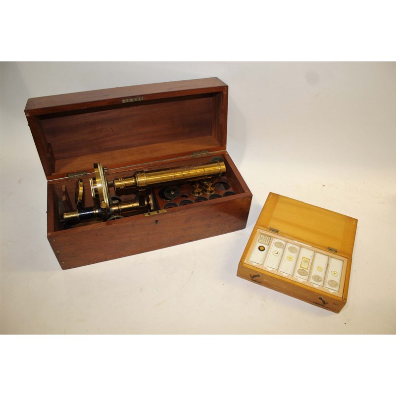 an interesting brass microscope by R & J Beck, the folding microscope with an adjustable base to set at differing angles, marked R & J Beck, 9252, London and Philadelphia, and in a fitted mahogany case and various lenses. Also with a box containing 36 various slides (insects, chemicals etc) some with professional labels including HMS Challenger, 1875. (2)