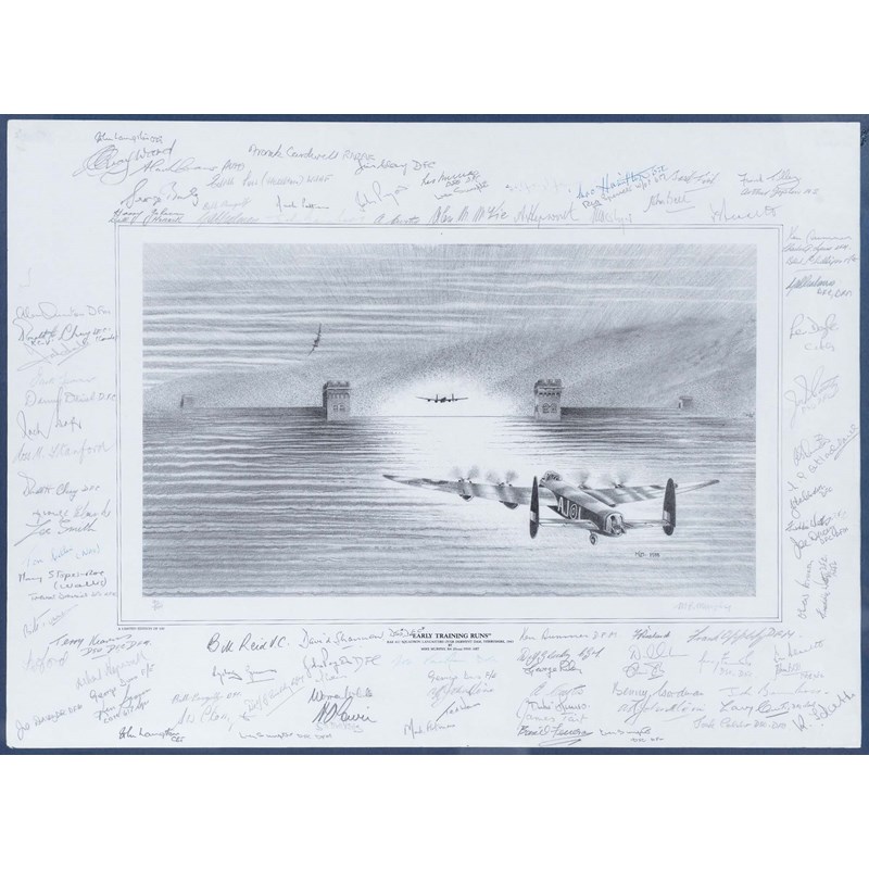 a limited edition print titled Early Training Runs, RAF 617 Sqaudron Lancasters Over Derwent Dam 1943, No 90 of 500. Signed by a large number of the squadron in pencil and ink, signatures include Bill Reid VC, David Shannon DSO, Les Munro DSO, Terry Kearns DSO, Leonard Sumpter, Jock Calder, Bill Pengelly, Ken Brown, Danny Daniel, Frank Appleby, Mary Stopes-Roe (Daughter of Barnes Wallis), James Clay, Freddie Watts, Larry Curtis, and many more (some signed more than once). Framed and mounted, 75.5cms by 60cms overall