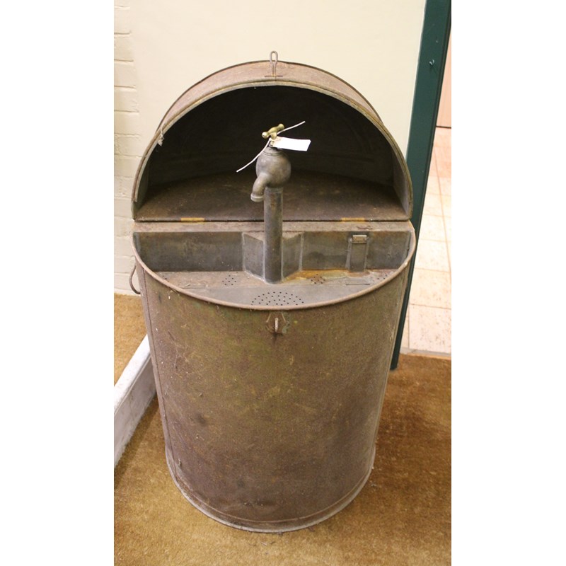 an interesting large oil dispensing cabinet, of circular shape and with a large hinged lid and carrying handles on both sides. The interior with a brass tap, measuring stick and opening for the oil. Plaque inside for Patent Oil Cabinet, The Valor Co Ltd, Birmingham. 110cms high