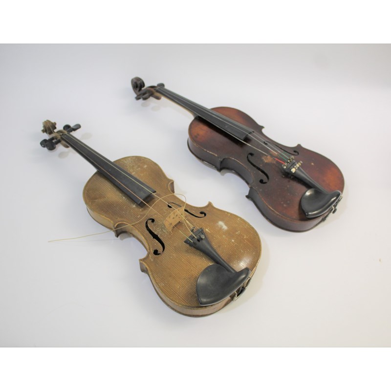 including a Violin stamped Stainer Patent, with a two piece back and in a fitted case and with a bow. Also with another Violin bearing a label, Mathias Geigennia cher in Mittenwald, 1851, Nro 94, also in a case and with a bow. Mittenwald 59cms long, Stainer 59cms long. (2)