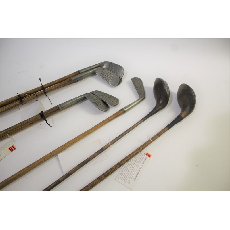 various clubs including a Dreadnought Driver (no makers name), a steel shafted wood by R Forgan, two Left Hand Mid Irons by A F Reid and Grant Andersons, a hickory shafted iron by R Forgan, and 3 hickory shafted irons by W Gibson. (8)