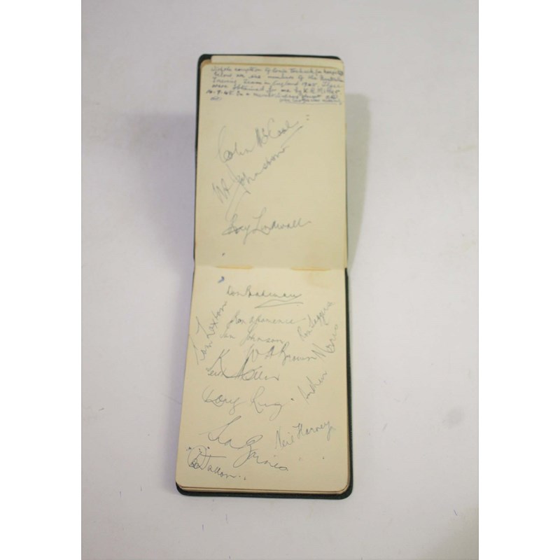 a small autograph album, one page with various signatures from the 1948 Australia touring side. Including Bradman, Lindwall, McCool, Johnson, Loxton, Brown, Harvey, Tallon, Archer, Miller, etc, with writing at the top of the page, With the exception of Ernie Toshack (in hospital) below are the members of the Australian touring team in England 1948, these were obtained for me by K R Miller 14/9/48, Hassett is also missing. Also with some cricket postcards, Joe Hardstaff booklet, and a book with hand written scorecards and reports on various Australian matches at home and abroad.