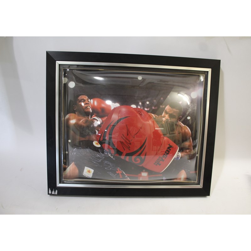 a boxing glove in a perspex case, signed in ink by Mike Tyson. With a certificate of authenticity on the back by Wonderland Memorabilia. Case 61cms across