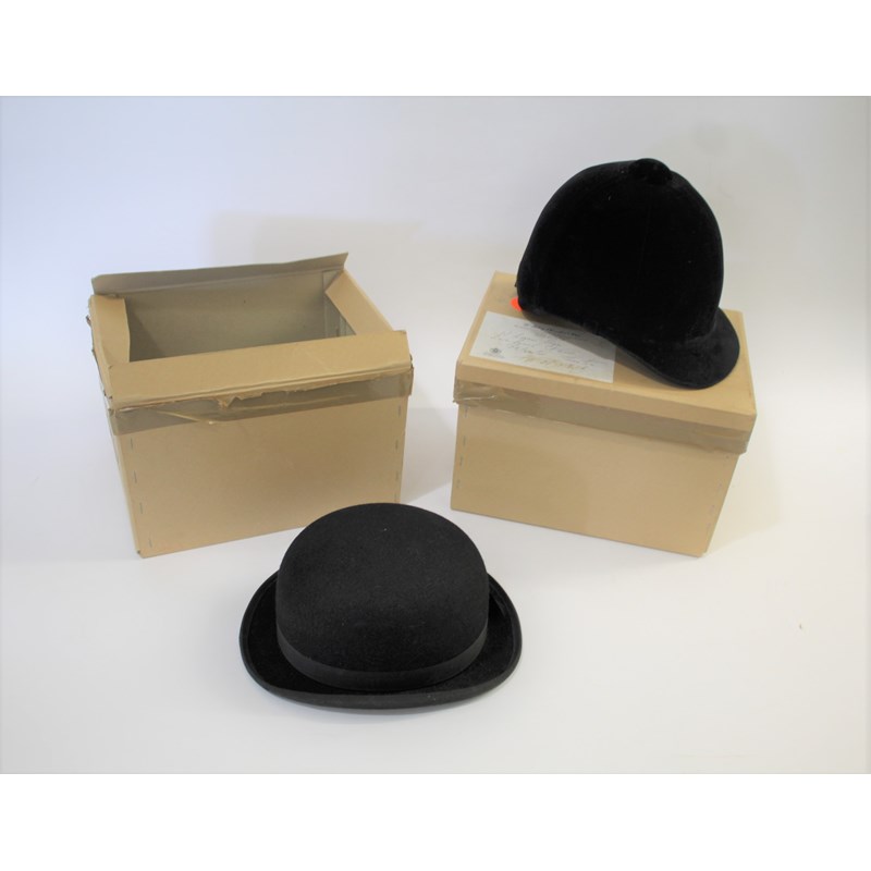 BOXED PATEY RIDING HAT & BOWLER HAT a S Patey riding hat size 7/57cms, in it's original box with Patey label. Also with a Lock & Co Bowler Hat. (2)