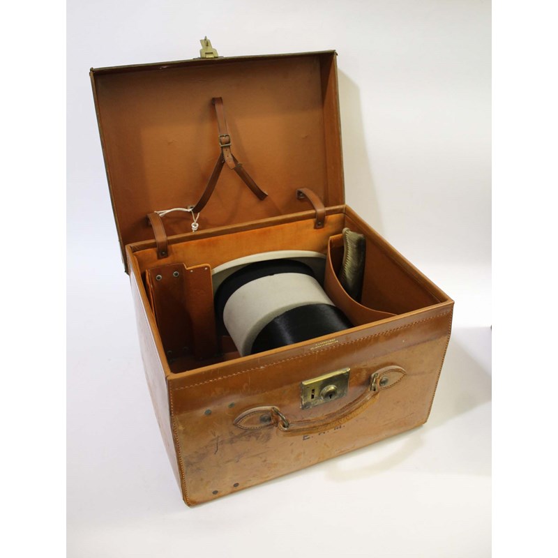 a large leather hat box by Lansdowne, Jermyn St, also with a black Top Hat by Lock & Co, London and a grey Top Hat by the same maker. With a brass lock and catch. Case 45cms across, 29cms high