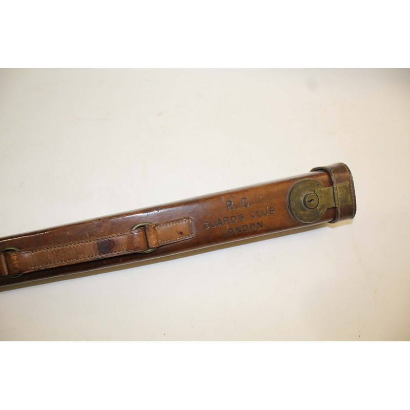 LEATHER GUN BARREL CASE - GUARDS CLUB a slender leather case for a spare Gun Barrel, with a brass lock and catch. Stamped, R.C, Guards Club, London. 71cms long