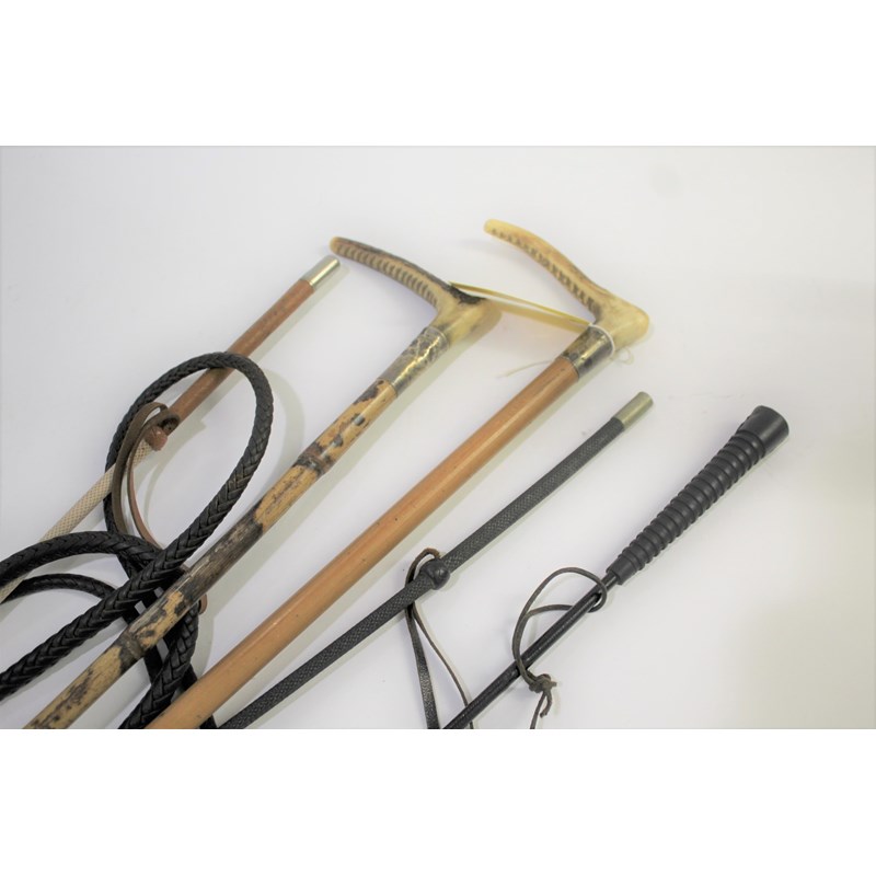 RIDING CROPS & WHIPS including two crops with silver collars, and 3 various whips. (5)