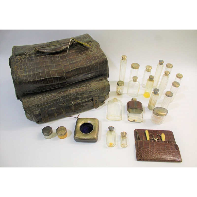 a crocodile skin gladstone bag, with various compartments for fittings including a crocodile skin inkwell, match striker and manicure items. Also with a variety of silver top jars (some with intials and some with the Starkie crest), silver pocket watch case, silver top scent bottle etc. Case 41cms across, 29cms high