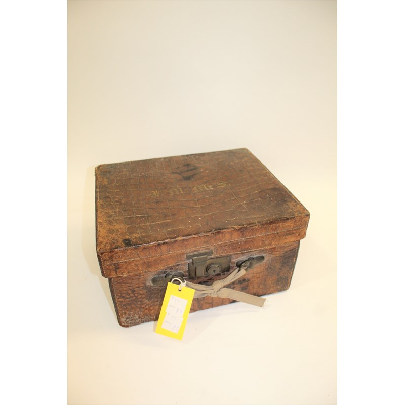 a square shaped case by Finnigans Ltd, Manchester, with a brass lock and silk lined interior. In need of some restoration. 36cms by 30cms