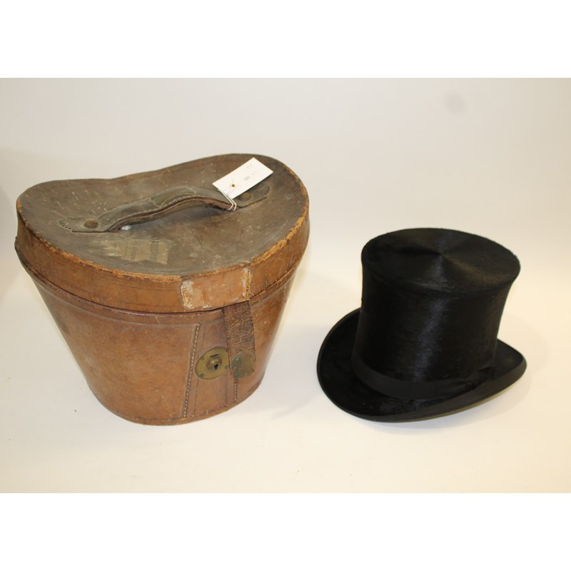 LEATHER CASED TOP HAT a vintage leather case with a lined interior, containing a black Top Hat by J McMillan Junr, High St, Yeovil. Case 27cms high