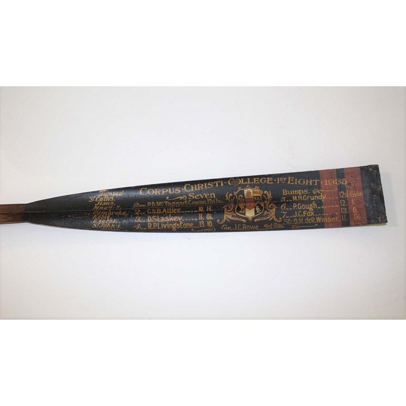 a large 1st eight rowing oar from 1935, painted with the names and weights of the rowers involved and also listing the names of the other colleges 'bumped' by their boat. Also painted with the crest of the college.