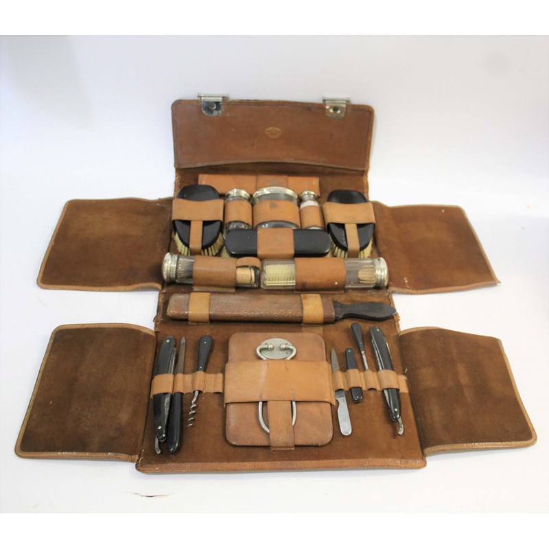 a leather folding case with various silver top bottles, ebony brushes and other accessories including razor, corkscrew etc. Marked inside for Drew & Sons, London, the outside of the case with the owners initials.