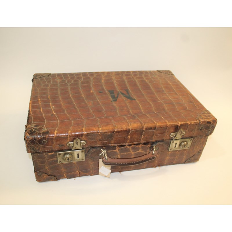 CROCODILE SKIN SUITCASE the case fitted with metal locks and clasps, with an owners initial on the top of the case. Case 57cms by 37cms