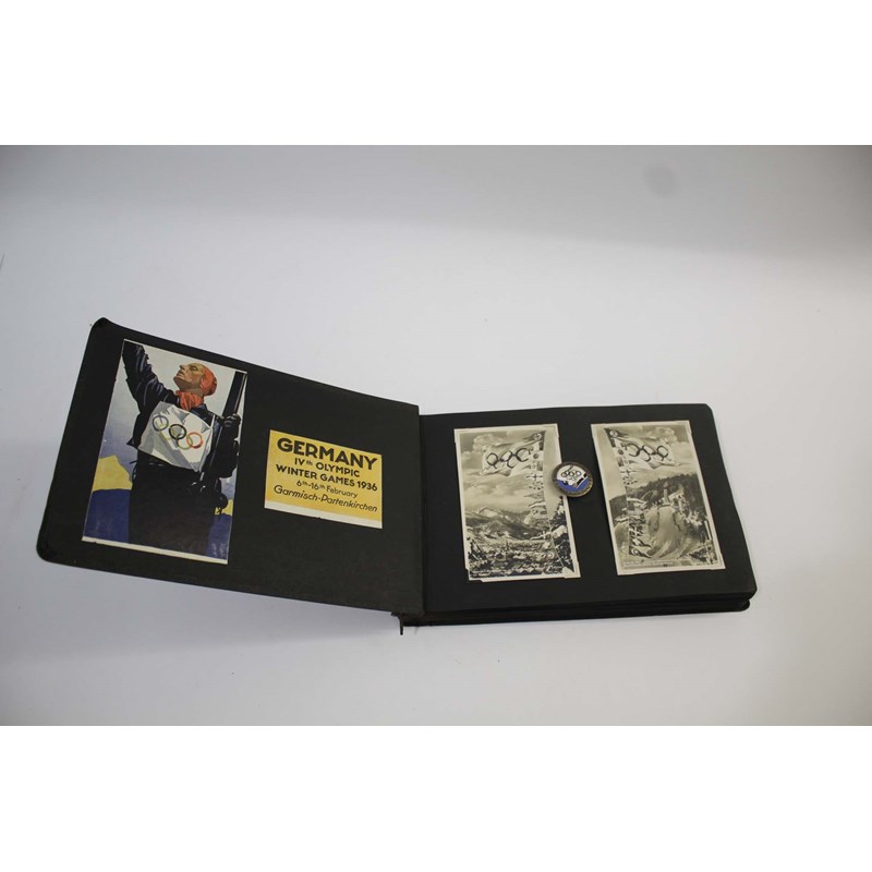 an interesting album, probably compiled by someone competing in the 1936 Winter Olympics in Germany. Including an Olympic Badge and postcards, and a variety of photographs including action shots from various events (Ski Jump, Pair Skating, Ice Hockey, Bobsleigh) and photographs in and around the event.