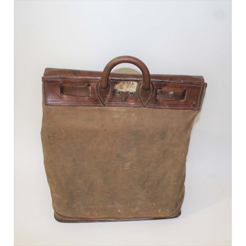 a vintage canvas and leather bag, with a leather carrying handle and leather strap. Stamped on the strap L Vuitton, and also stamped Vuitton on two buttons, the strap with a brass lock and key to secure it. 62cms high (to top of handle).