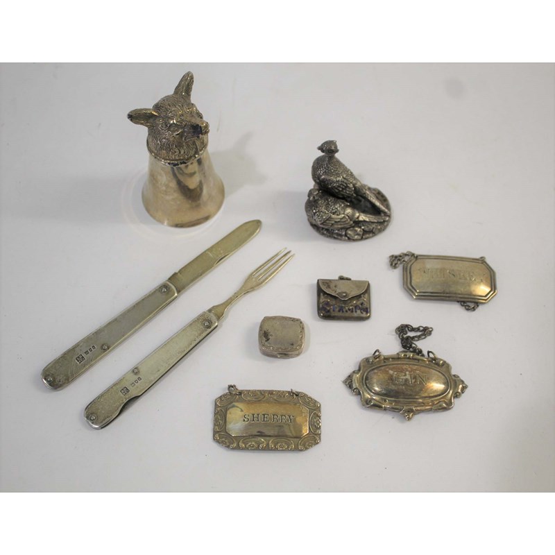 a silver knife and fork (silver handles and blades), with fold away blades by Sampson Mordan, the knife marked J Clarksons Patent. Also with a silver stamp case, small silver pill box, modern silver group of Pheasants, plated Fox stirrup cup etc. Knife and Fork marked for London 1897, SM & Co.