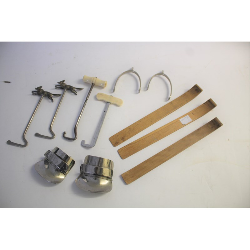 a pair of boot pulls with handles in the form of Foxes, also with a vintage bone handled boot pull and vintage ivory handled boot pull, wooden boot stretchers, spurs etc.