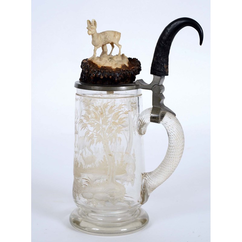 an interesting bohemian engraved glass tankard, with a depiction of a Stag and Deer in a wooden landscape. With a metal lid mounted with a carved animal, and the handle mounted with a horn. 9ins (23cms) high