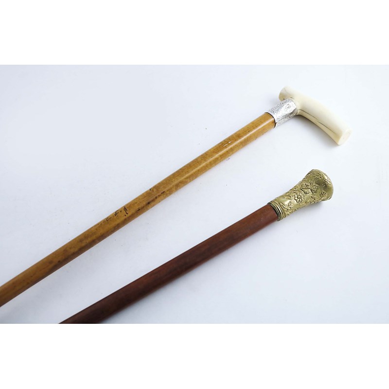 with a baluster gilt-metal handle, chased with flowers and an Edwardian malacca walking stick with an ivory handle and an engraved silver ferrule, inscribed "H. Wells, York Gate" & hallmarked Birmingham 1903; the latter 36" (91.8 cms) long (2)