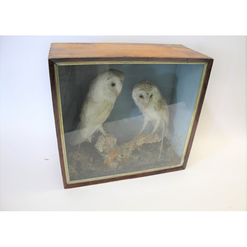 CASED BARN OWLS two Barn Owl's, mounted in a naturalistic background and in a glazed and wooden case. Case 50cms across, 47cms high