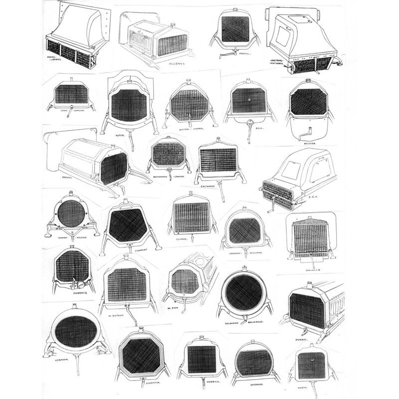 A green folder holding a wealth of reference material and titled images of motor-car radiators. A very detailed study of different types dating from about 1905 through to the mid-1930s, with the emphasis on the veteran period. Most of the pages, each in a clear pocket, are well-defined photocopies from an assortment of British and European literature, a tour-de-force of effort, with cutting and pasting and assiduous assembling.